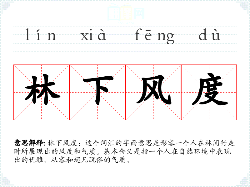 林下风度:这个词汇的字面意思是形容一个人在林间行走时所展现出的风度和气质。基本含义是指一个人在自然环境中表现出的优雅、从容和超凡脱俗的气质。