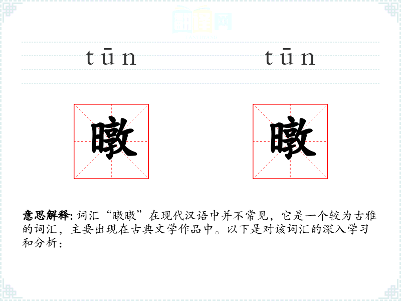 词汇“暾暾”在现代汉语中并不常见,它是一个较为古雅的词汇,主要出现在古典文学作品中。以下是对该词汇的深入学*和分析:
