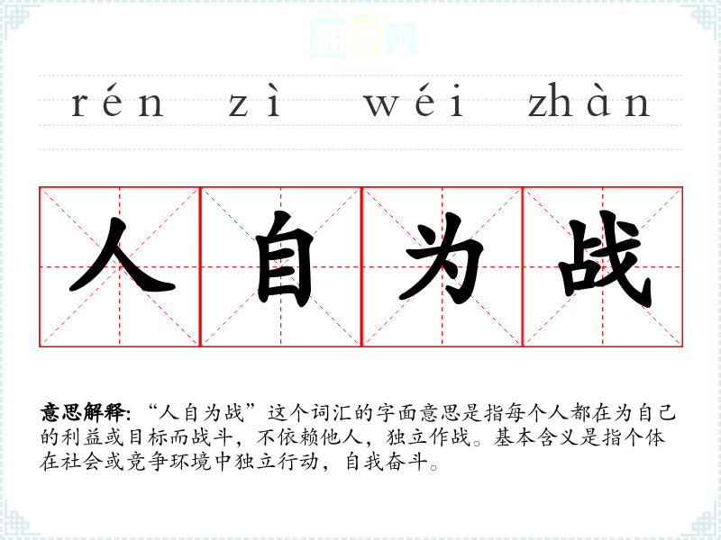 “人自为战”这个词汇的字面意思是指每个人都在为自己的利益或目标而战斗,不依赖他人,独立作战。基本含义是指个体在社会或竞争环境中独立行动,自我奋斗。