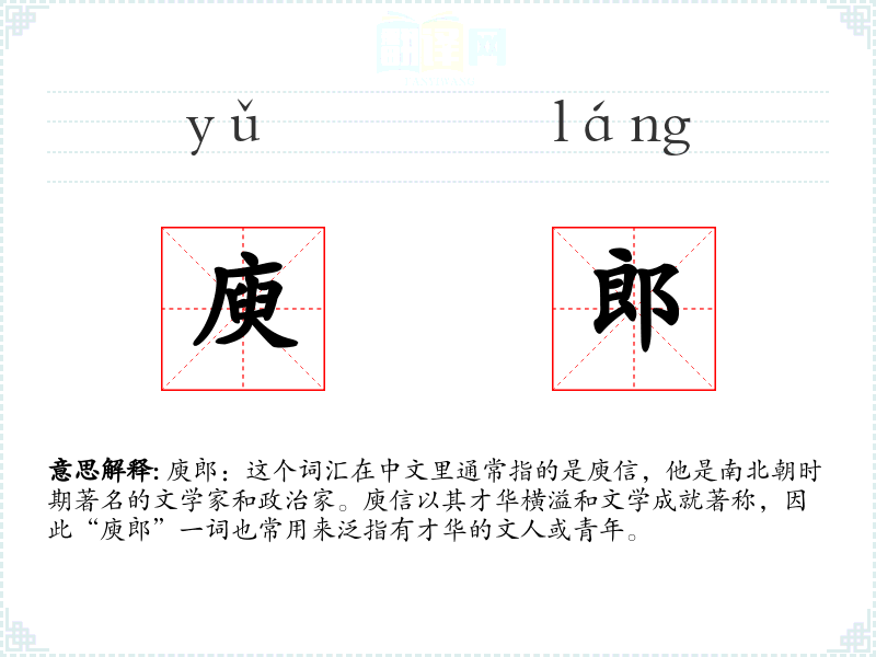 “庾郎”一词源自对庾信的尊称,随着时间的推移,逐渐演变成对有才华文人的泛称。在古代文学中,庾信的作品对后世影响深远,因此“庾郎”也带有一定的文化传承意义。