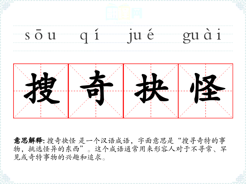 搜奇抉怪 是一个汉语成语,字面意思是“搜寻奇特的事物,挑选怪异的东西”。这个成语通常用来形容人对于不寻常、罕见或奇特事物的兴趣和追求。