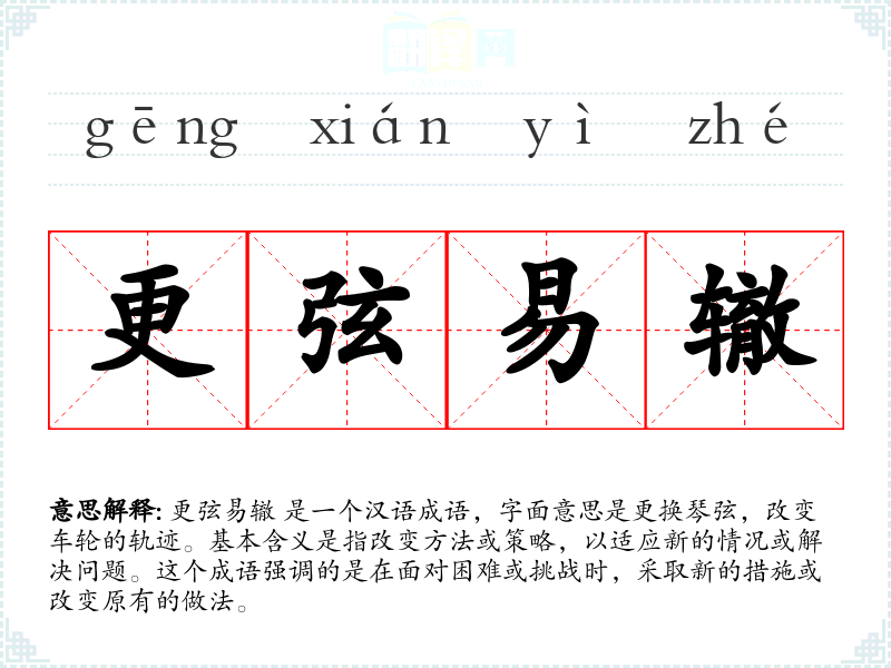 更弦易辙 是一个汉语成语,字面意思是更换琴弦,改变车轮的轨迹。基本含义是指改变方法或策略,以适应新的情况或解决问题。这个成语强调的是在面对困难或挑战时,采取新的措施或改变原有的做法。
