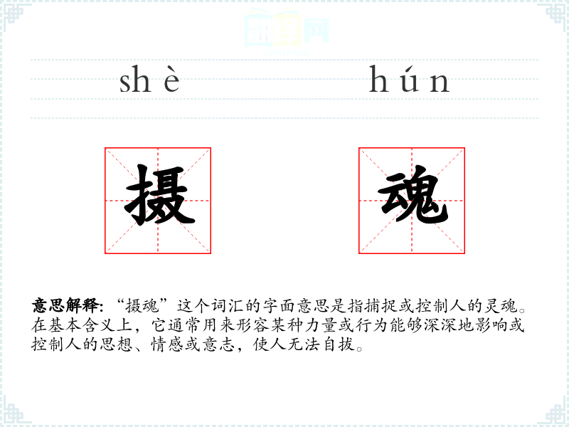 同义词中,“迷魂”和“夺魄”与“摄魂”在意义上相近,都指对人的精神或情感产生强烈影响。反义词则表示从这种强烈影响中恢复或保持清醒状态。