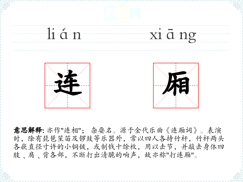 1.亦作"连相"; 杂耍名。源于金代乐曲《连厢词》。表演时,除有琵琶笙笛及锣鼓等乐器外,常以四人各持竹杆,竹杆两头各嵌直径寸许的小铜钹,或制钱十馀枚,用以击节,并敲击身体四肢﹑肩﹑背各部,不断打出清脆的响声,故亦称"打连厢"。
