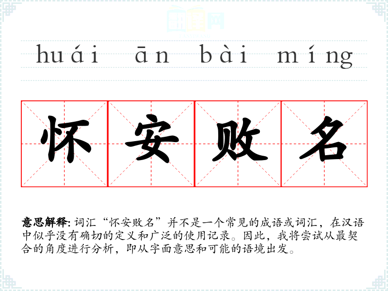 词汇“怀安败名”并不是一个常见的成语或词汇,在汉语中似乎没有确切的定义和广泛的使用记录。因此,我将尝试从最契合的角度进行分析,即从字面意思和可能的语境出发。