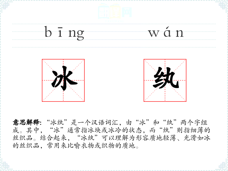 “冰纨”一词的词源较为直接,由“冰”和“纨”两个字组合而成,用以形容织物的质地。在古代文学中,这个词汇常用来形容华美的衣物,随着时间的推移,其使用范围和语境有所扩展,但基本含义保持不变。