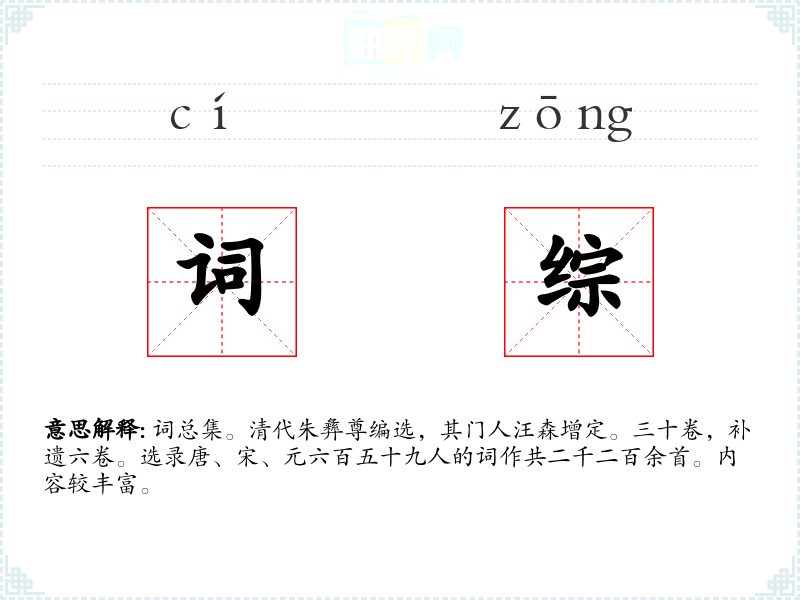 "词综"的意思解释、词综是什么意思由翻译网汉语词典查词提供。