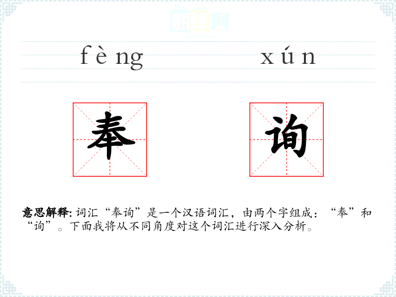 词汇“奉询”是一个汉语词汇,由两个字组成:“奉”和“询”。下面我将从不同角度对这个词汇进行深入分析。