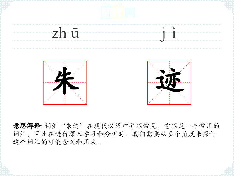词汇“朱迹”在现代汉语中并不常见,它不是一个常用的词汇,因此在进行深入学*和分析时,我们需要从多个角度来探讨这个词汇的可能含义和用法。