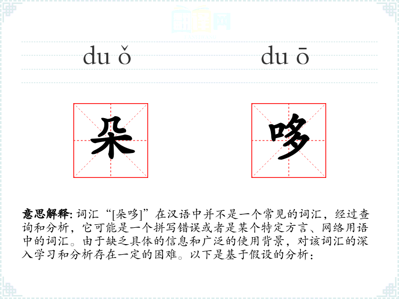 词汇“[朵哆]”在汉语中并不是一个常见的词汇,经过查询和分析,它可能是一个拼写错误或者是某个特定方言、网络用语中的词汇。由于缺乏具体的信息和广泛的使用背景,对该词汇的深入学习和分析存在一定的困难。以下是基于假设的分析: