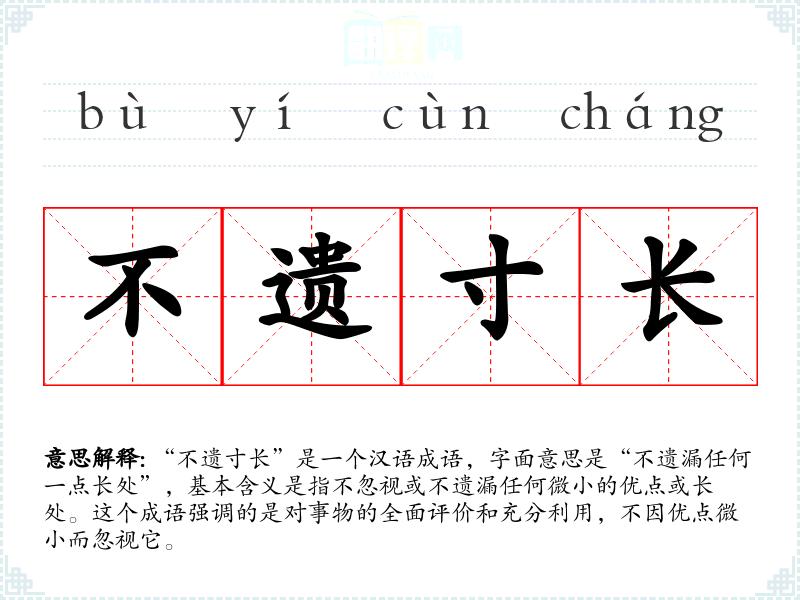 “不遗寸长”这个成语来源于**古代的文献,具体出处不详,但其含义和用法在古代文献中已有体现。随着时间的推移,这个成语的含义和用法基本保持稳定,强调的是对事物全面和细致的考虑。