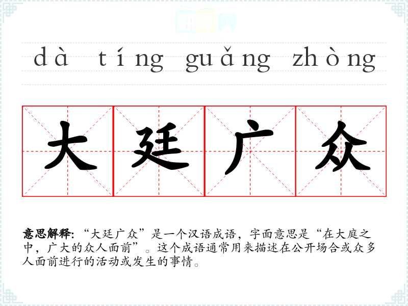 “大廷广众”是一个汉语成语,字面意思是“在大庭之中,广大的众人面前”。这个成语通常用来描述在公开场合或众多人面前进行的活动或发生的事情。
