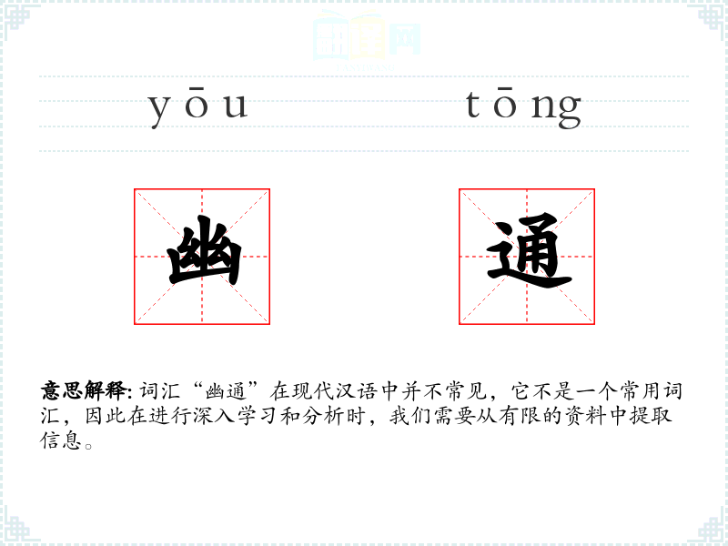 词汇“幽通”在现代汉语中并不常见,它不是一个常用词汇,因此在进行深入学*和分析时,我们需要从有限的资料中提取信息。
