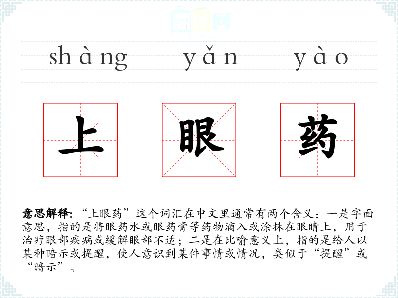 在日常口语或文学作品中,这个词汇更多地被用作比喻,表示给予某人某种提示或暗示。例如,在团队合作中,当某人可能忽视了某个重要细节时,同事可能会通过某种方式“给他上上眼药”,让他注意到这个问题。