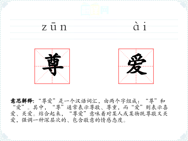 “尊爱”是一个汉语词汇,由两个字组成:“尊”和“爱”。其中,“尊”通常表示尊敬、尊重,而“爱”则表示喜爱、关爱。结合起来,“尊爱”意味着对某人或某物既尊敬又关爱,强调一种深层次的、包含敬意的情感态度。