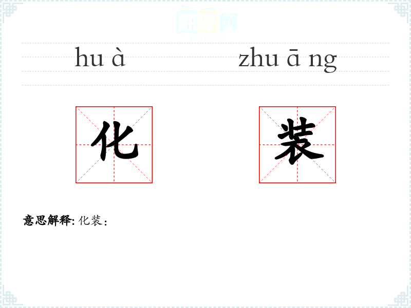 - 词源:化装一词源于汉语,由“化”和“装”两个字组成,“化”有变化之意,“装”指装扮。