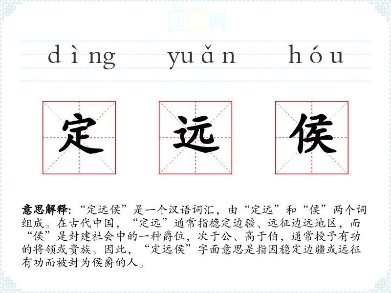 “定远侯”是一个汉语词汇,由“定远”和“侯”两个词组成。在古代**,“定远”通常指稳定边疆、远征边远地区,而“侯”是封建社会中的一种爵位,次于公、高于伯,通常授予有功的将领或贵族。因此,“定远侯”字面意思是指因稳定边疆或远征有功而被封为侯爵的人。