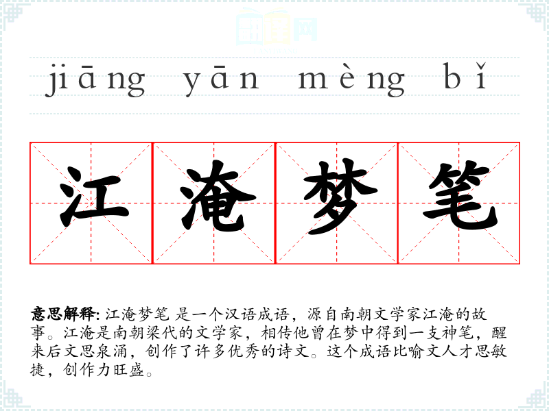 江淹梦笔 这个成语源自江淹的传说故事,后来被广泛用于文学和日常语言中,成为形容文人才华和创作力的常用表达。