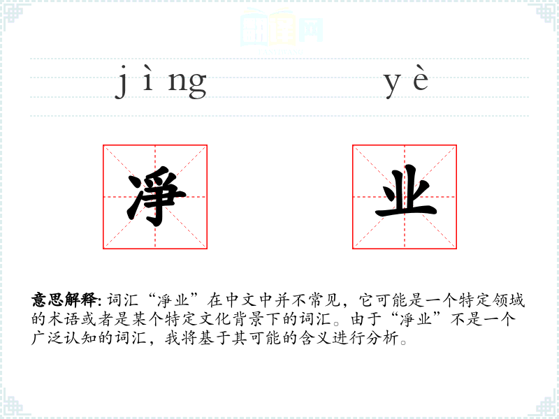 词汇“凈业”在中文中并不常见,它可能是一个特定领域的术语或者是某个特定文化背景下的词汇。由于“凈业”不是一个广泛认知的词汇,我将基于其可能的含义进行分析。