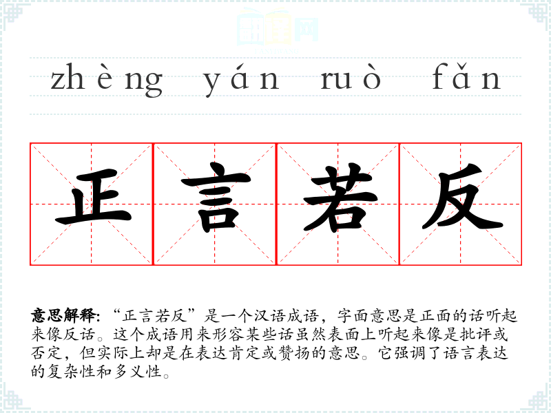 “正言若反”是一个汉语成语,字面意思是正面的话听起来像反话。这个成语用来形容某些话虽然表面上听起来像是批评或否定,但实际上却是在表达肯定或赞扬的意思。它强调了语言表达的复杂性和多义性。