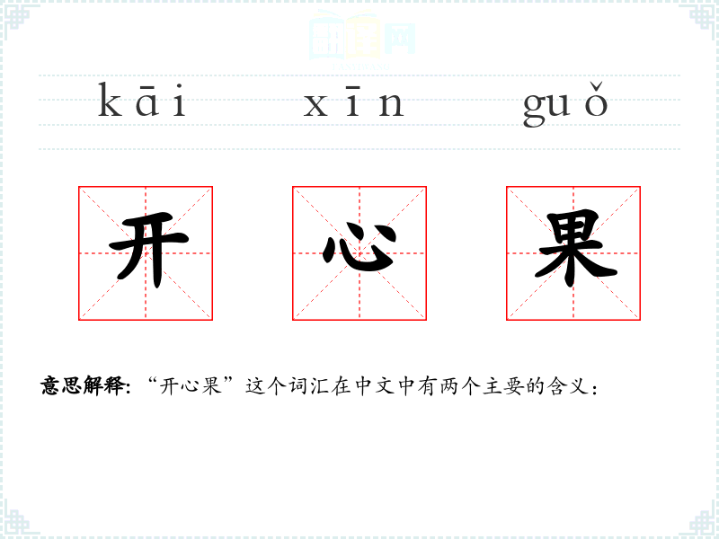 - 字面意思:一种坚果,学名为Pistacia vera,原产于中亚和西亚地区,因其形状像心脏且开口处呈微笑状,故得名“开心果”。