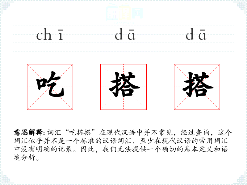 词汇“吃搭搭”在现代汉语中并不常见,经过查询,这个词汇似乎并不是一个标准的汉语词汇,至少在现代汉语的常用词汇中没有明确的记录。因此,我们无法提供一个确切的基本定义和语境分析。