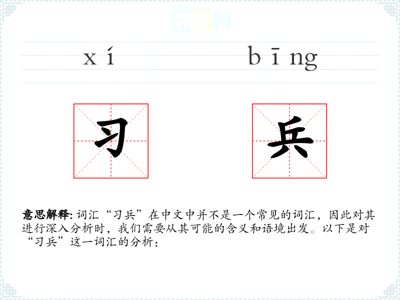 “兵”字面意思是指练军事技能或兵法。其中,“”通常指学或练*,“兵”可以指士兵、军队或军事。