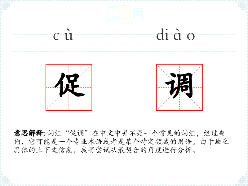 词汇“促调”在中文中并不是一个常见的词汇,经过查询,它可能是一个专业术语或者是某个特定领域的用语。由于缺乏具体的上下文信息,我将尝试从最契合的角度进行分析。