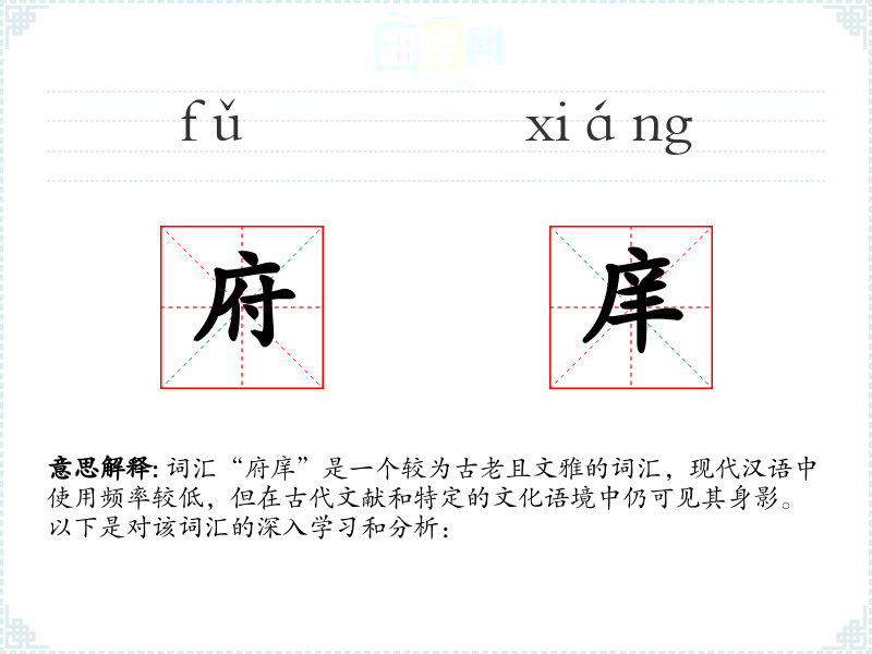 词汇“府庠”是一个较为古老且文雅的词汇,现代汉语中使用频率较低,但在古代文献和特定的文化语境中仍可见其身影。以下是对该词汇的深入学*和分析: