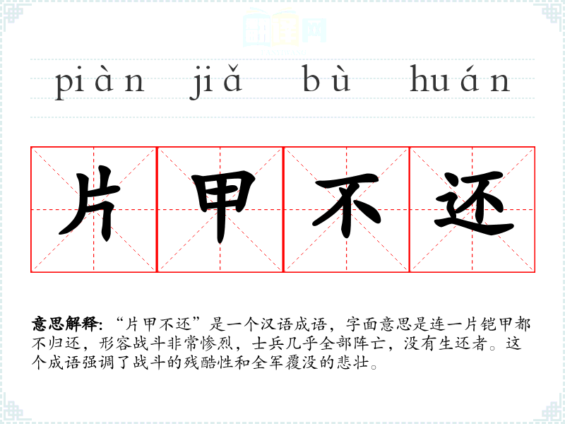 “片甲不还”是一个汉语成语,字面意思是连一片铠甲都不归还,形容战斗非常惨烈,士兵几乎全部阵亡,没有生还者。这个成语强调了战斗的残酷性和全军覆没的悲壮。