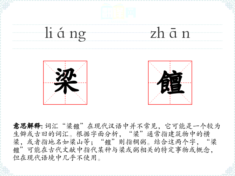 词汇“梁饘”在现代汉语中并不常见,它可能是一个较为生僻或古旧的词汇。根据字面分析,“梁”通常指建筑物中的横梁,或者指地名如梁山等;“饘”则指稠粥。结合这两个字,“梁饘”可能在古代文献中指代某种与梁或粥相关的特定事物或概念,但在现代语境中几乎不使用。