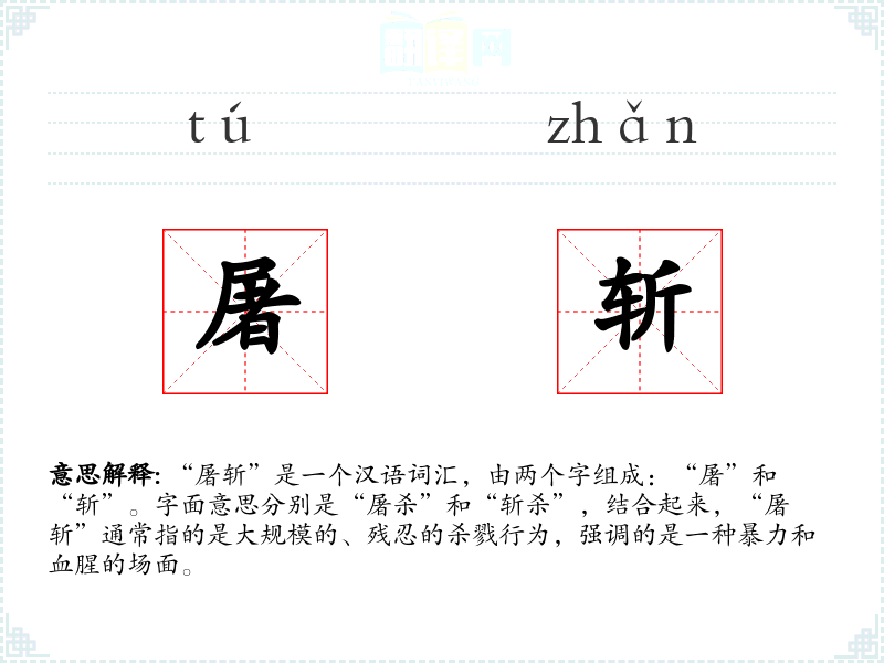 “屠”字最早见于甲骨文,原意为宰杀牲畜,后引申为杀戮。“斩”字则有明确的斩杀之意,两个字结合后,强化了暴力和血腥的意味。