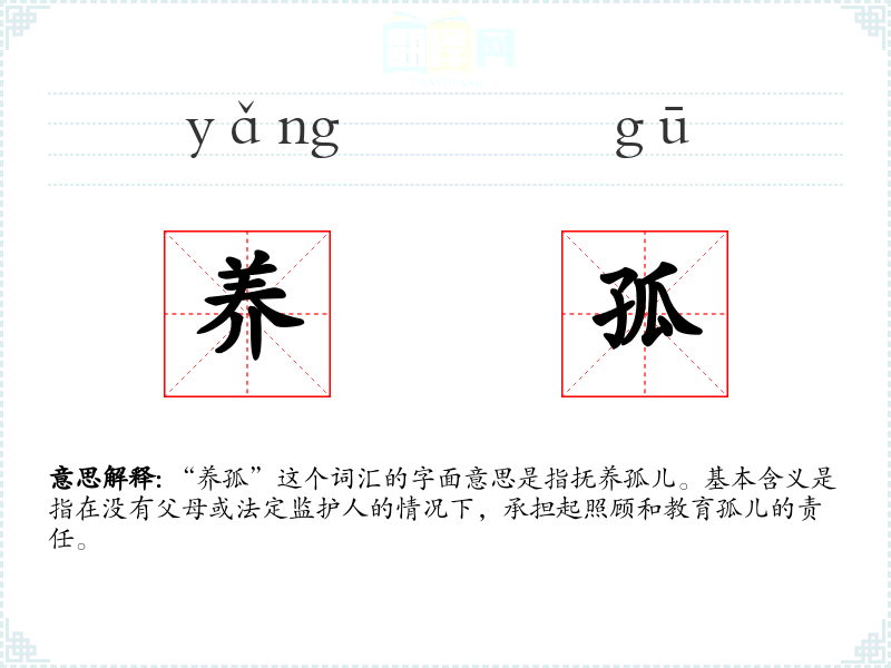 “养孤”这个词汇的字面意思是指抚养孤儿。基本含义是指在没有父母或法定监护人的情况下,承担起照顾和教育孤儿的责任。