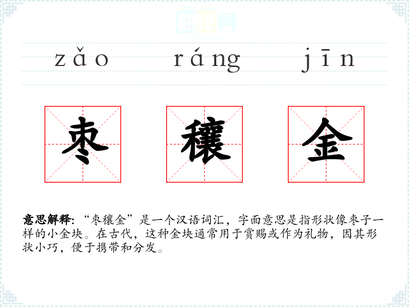 “枣穰金”是一个汉语词汇,字面意思是指形状像枣子一样的小金块。在古代,这种金块通常用于赏赐或作为礼物,因其形状小巧,便于携带和分发。