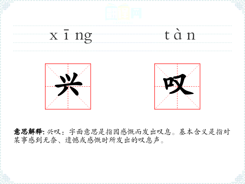 兴叹:字面意思是指因感慨而发出叹息。基本含义是指对某事感到无奈、遗憾或感慨时所发出的叹息声。