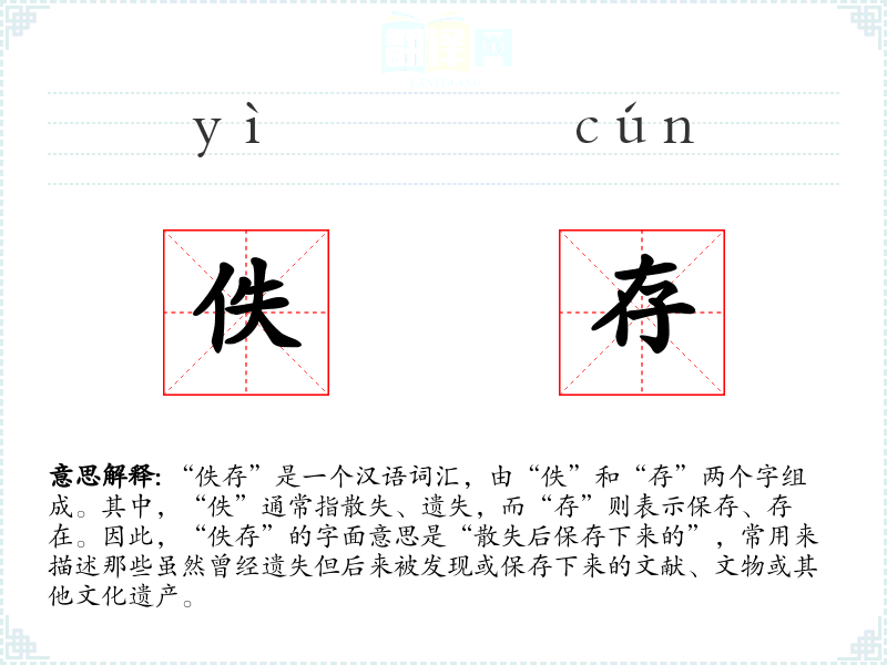 结合图片,可以想象一幅描绘古代文献或文物的画面,如古籍、壁画等,这些图像能够唤起对“佚存”的视觉联想。在听觉上,可以想象一段描述古代文献发现的纪录片旁白,增强听觉体验。