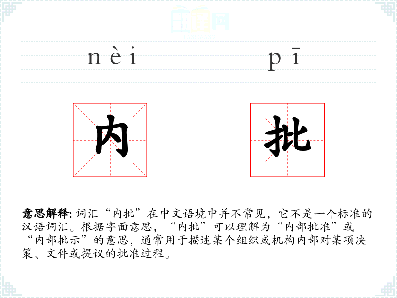 词汇“内批”在中文语境中并不常见,它不是一个标准的汉语词汇。根据字面意思,“内批”可以理解为“内部批准”或“内部批示”的意思,通常用于描述某个组织或机构内部对某项决策、文件或提议的批准过程。