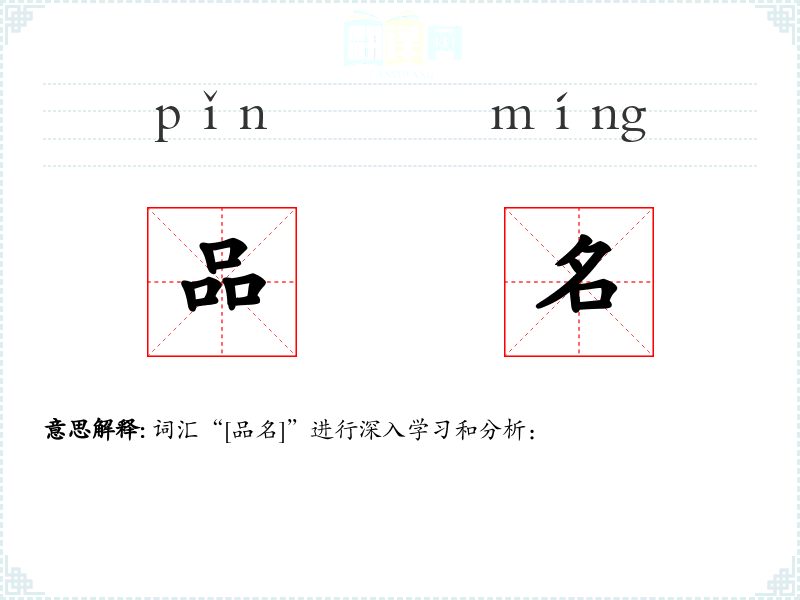 词源与演变: “品名”由“品”和“名”两个字组成。“品”字古汉语中指物品、货物,而“名”字指名称、名字。两者结合,形成了现代汉语中表示物品名称的词汇。