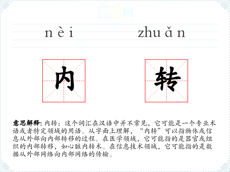内转:这个词汇在汉语中并不常见,它可能是一个专业术语或者特定领域的用语。从字面上理解,“内转”可以指物体或信息从外部向内部转移的过程。在医学领域,它可能指的是器官或组织的内部转移,如心脏内转术。在信息技术领域,它可能指的是数据从外部网络向内部网络的传输。