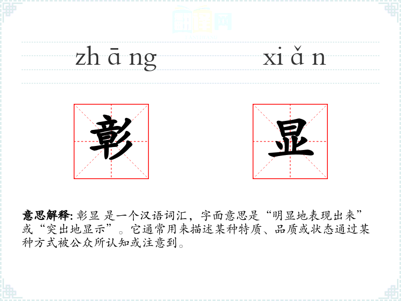 彰显 这个词源于古代汉语,由“彰”和“显”两个字组成。在古代文献中,它常用于描述君主的德行或功绩的公开表彰。随着时间的推移,其使用范围扩大,现在广泛应用于各种语境中。