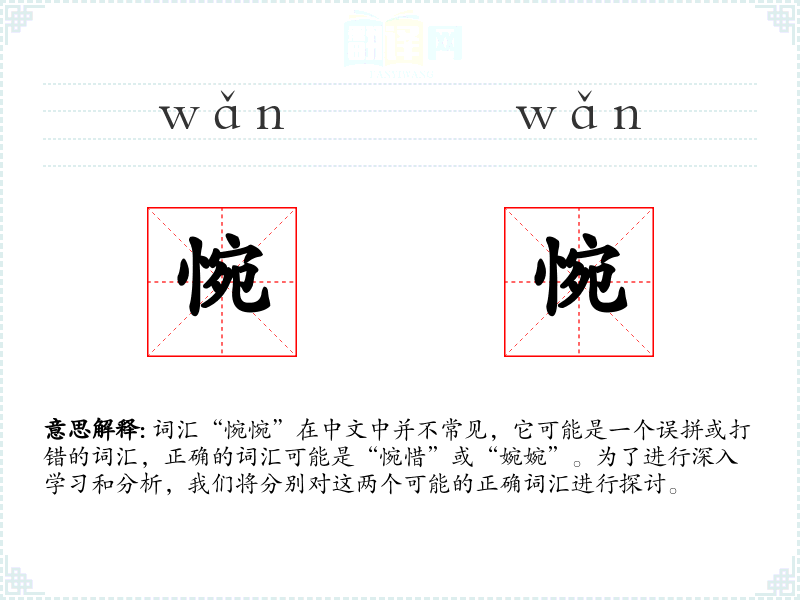 词汇“惋惋”在中文中并不常见,它可能是一个误拼或打错的词汇,正确的词汇可能是“惋惜”或“婉婉”。为了进行深入学习和分析,我们将分别对这两个可能的正确词汇进行探讨。