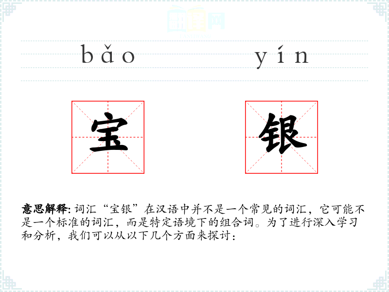 词汇“宝银”在汉语中并不是一个常见的词汇,它可能不是一个标准的词汇,而是特定语境下的组合词。为了进行深入学*和分析,我们可以从以下几个方面来探讨: