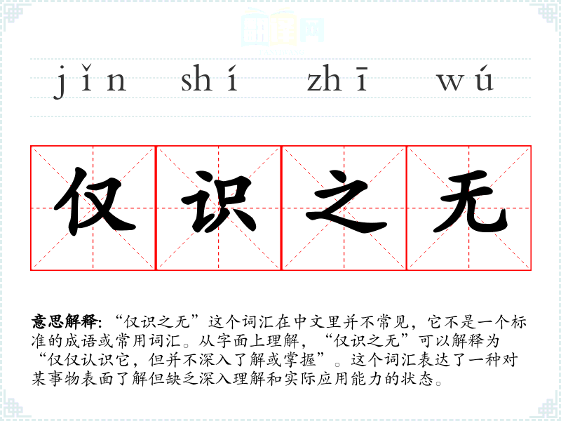 “仅识之无”这个词汇在中文里并不常见,它不是一个标准的成语或常用词汇。从字面上理解,“仅识之无”可以解释为“仅仅认识它,但并不深入了解或掌握”。这个词汇表达了一种对某事物表面了解但缺乏深入理解和实际应用能力的状态。
