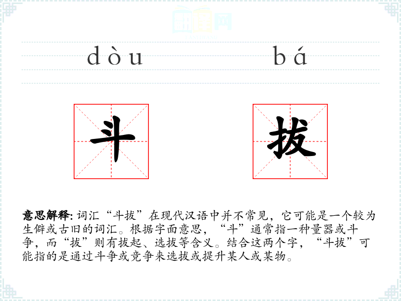 - 理解:斗拔是一个富有历史和文化内涵的词汇,虽然在现代汉语中不常见,但它反映了古代社会的人才选拔方式和竞争精神。