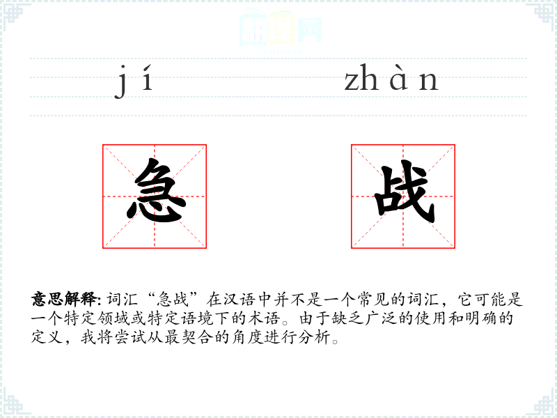 词汇“急战”在汉语中并不是一个常见的词汇,它可能是一个特定领域或特定语境下的术语。由于缺乏广泛的使用和明确的定义,我将尝试从最契合的角度进行分析。