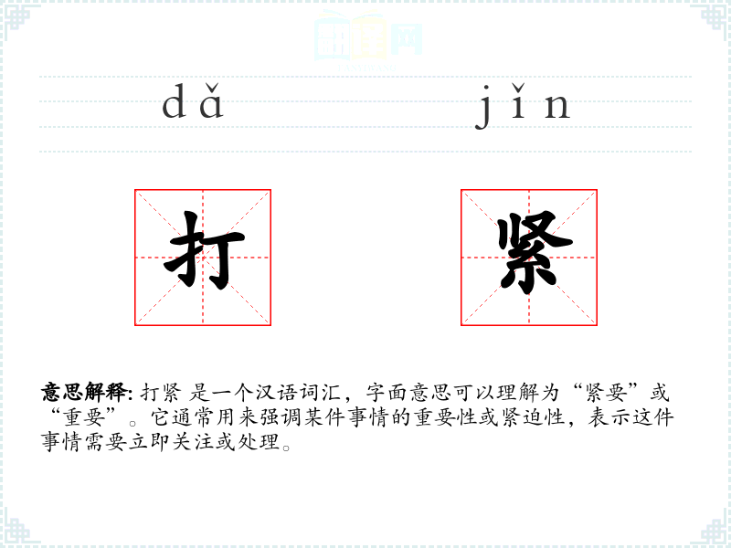 - 口语语境:在日常口语中,打紧 常用来表达对某件事情的重视,如“这件事打紧,你一定要记得。”