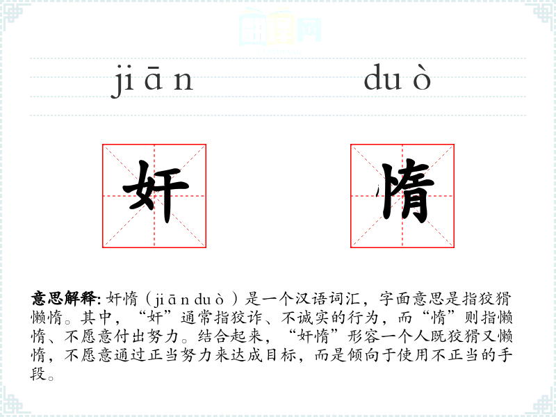 “奸惰”作为一个复合词,其构成部分“奸”和“惰”在古代汉语中已有使用。随着时间的推移,这两个词结合在一起,形成了描述特定性格特征的词汇。