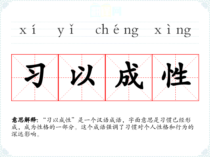 “以成性”是一个汉语成语,字面意思是惯已经形成,成为性格的一部分。这个成语强调了*惯对个人性格和行为的深远影响。