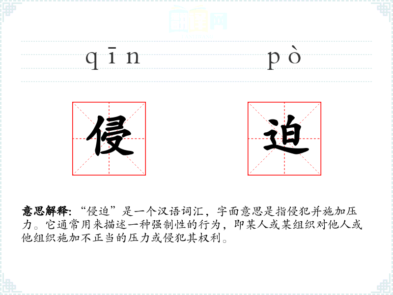 在英语中,“侵迫”可以对应到“oppression”或“intimidation”,这些词汇在西方文化中也用来描述类似的负面行为。