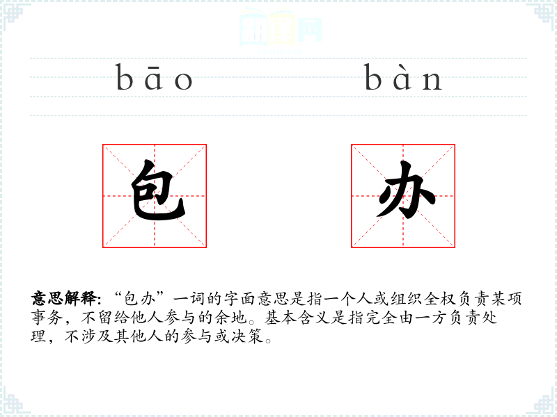 “包办”一词的字面意思是指一个人或组织全权负责某项事务,不留给他人参与的余地。基本含义是指完全由一方负责处理,不涉及其他人的参与或决策。